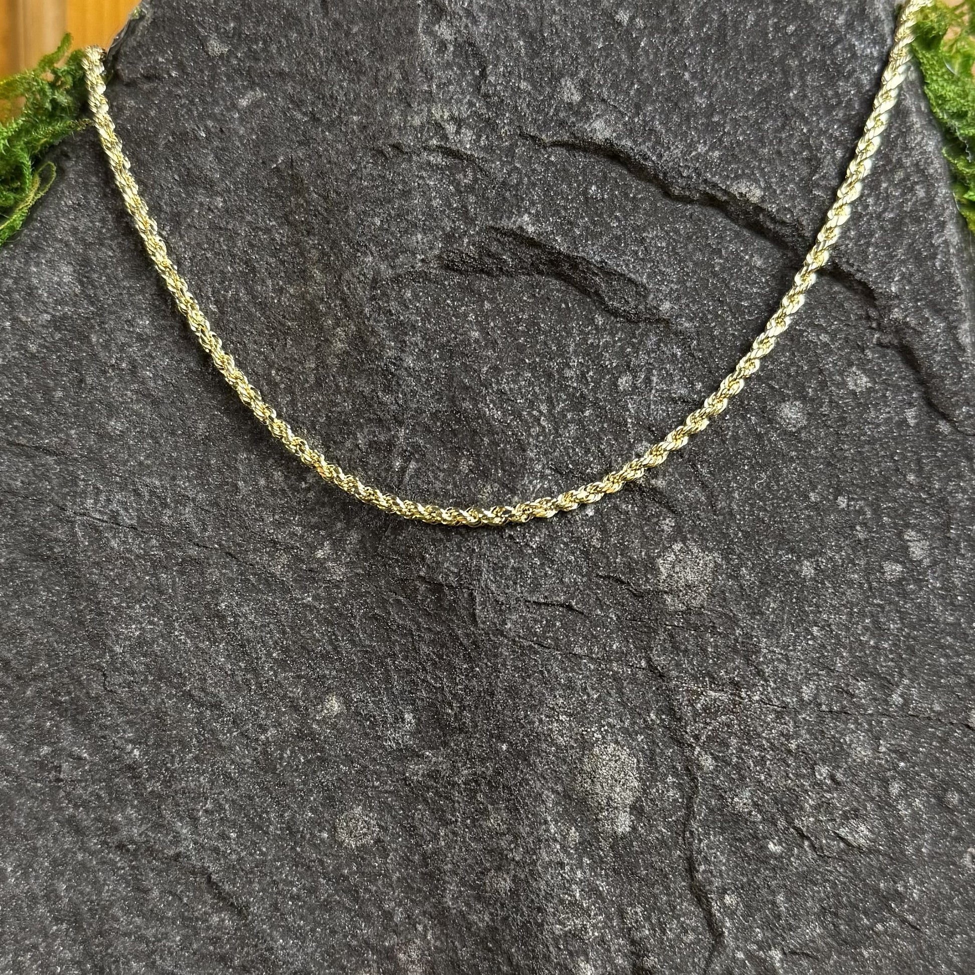 A rope chain is a type of jewelry chain made from small, interlocking oval or round links that are twisted together to resemble a rope. This construction makes them strong, durable, and flexible, and they are versatile enough to be worn alone as a statement piece or with a pendant. They are often made from materials like gold, silver, or stainless steel, and can be found in various widths and styles, including a "diamond-cut" version with faceted links that create extra sparkle.