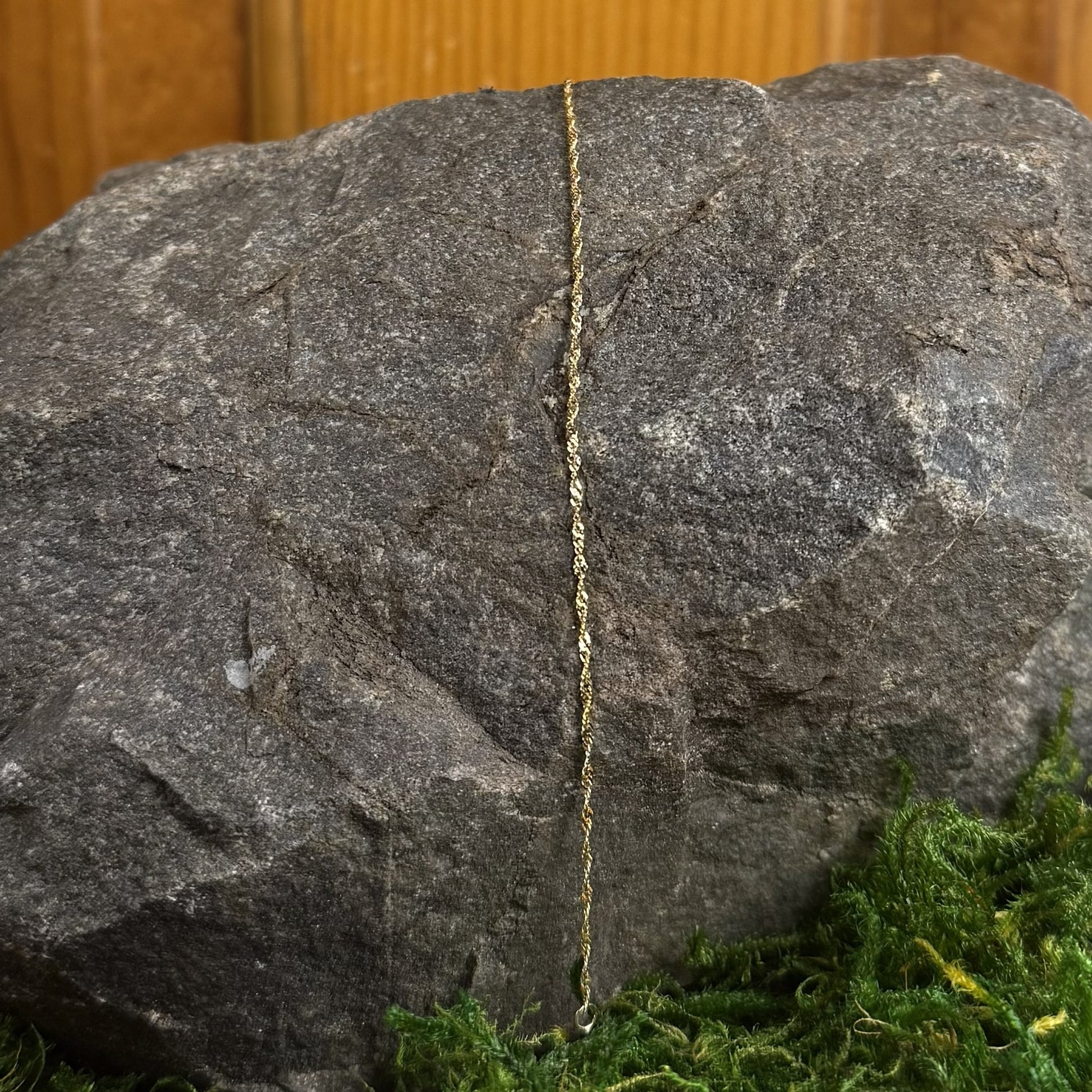 A Singapore mirror chain is a delicate, elegant jewelry chain known for its unique twisted link pattern and exceptional liquid-like sparkle. The links are flattened, curved, and twisted, blending the styles of a curb chain and a rope chain into a continuous spiral. The links naturally twist on their own when worn.